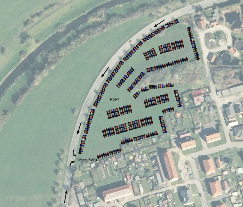 Nach Rücksprache mit der Gemeinde Deutzen können wir seit 2016 weitere Parkplätze anbieten. Es handelt sich dabei um eine Wiese an der S 50, ca. 800 m vom Festivalgelände entfernt. Der Parkplatz P 3/4 ist ausgeschildert, die Zufahrt erfolgt direkt von der S 50.